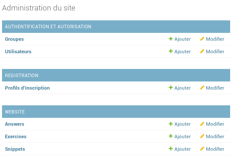 ## Need an admin interface now ```python from django.contrib import admin from website.models import Answer, Exercise admin.site.register(Answer) admin.site.register(Exercise) ```