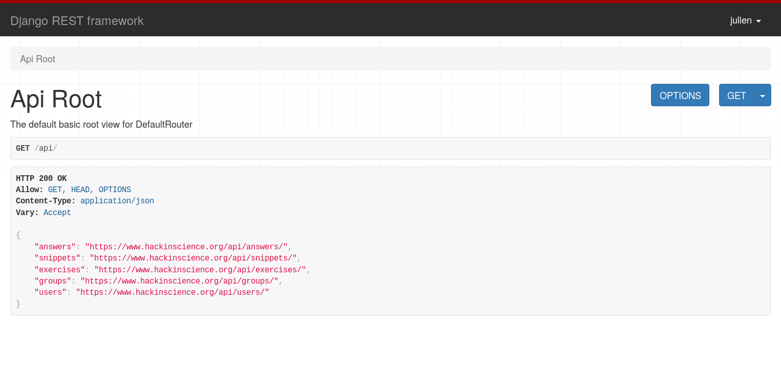 ## Need an API now ```python class ExerciseSerializer(serializers.HyperlinkedModelSerializer): class Meta: model = Exercise fields = '__all__' class ExerciseViewSet(viewsets.ModelViewSet): queryset = Exercise.objects.all() serializer_class = ExerciseSerializer router = routers.DefaultRouter() router.register('exercises', ExerciseViewSet) ```