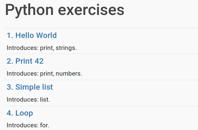 ## 2015: Focus on content We started by focusing on exercises (needed to give a course) and the correction bot (needed to scale). Workflow from a student point of view: - Clone the exercise repo - Do exercises - git push - Receive a mail with the correction