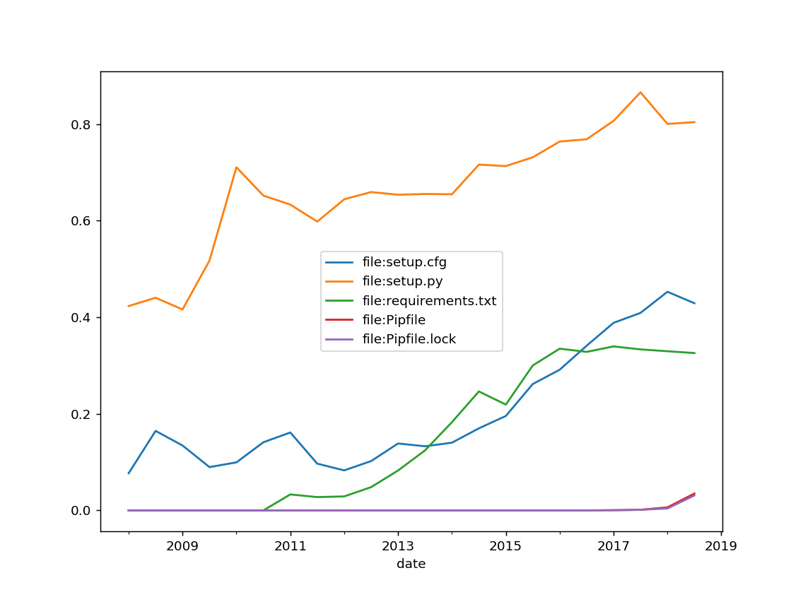 ## Requirements ```python setups = stats['file:setup.cfg', 'file:setup.py', 'file:requirements.txt', 'file:Pipfile', 'file:Pipfile.lock'].mean().plot() ```